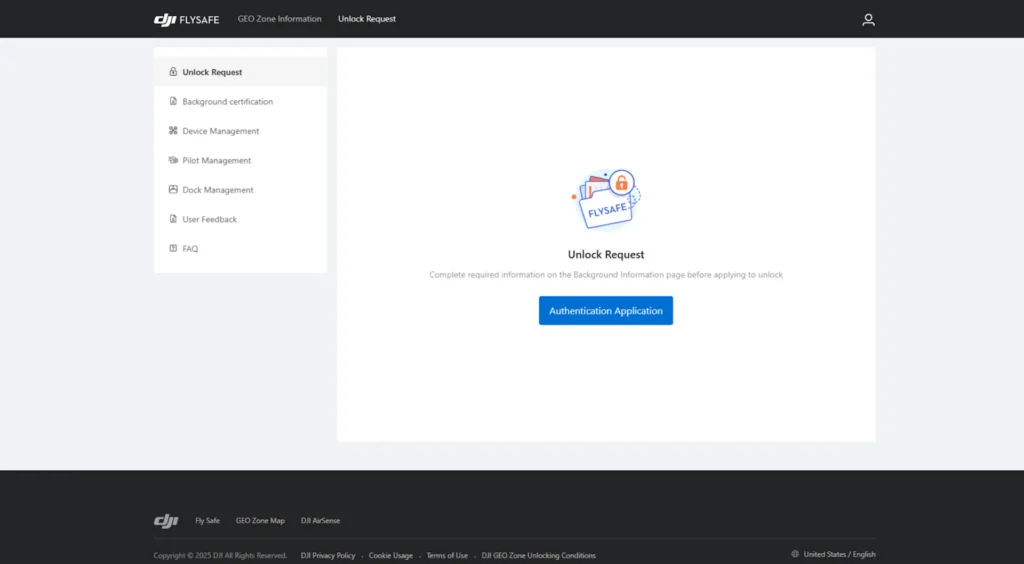 Truy cập FlySafe Unlock Portal, đăng nhập và chọn Authentication Application. Tiếp theo, chọn Personal/Organisation/Government và Country/Region, rồi nhập đầy đủ thông tin để xác minh.