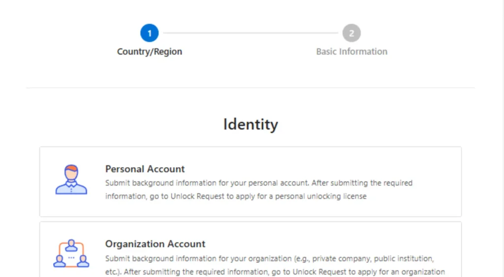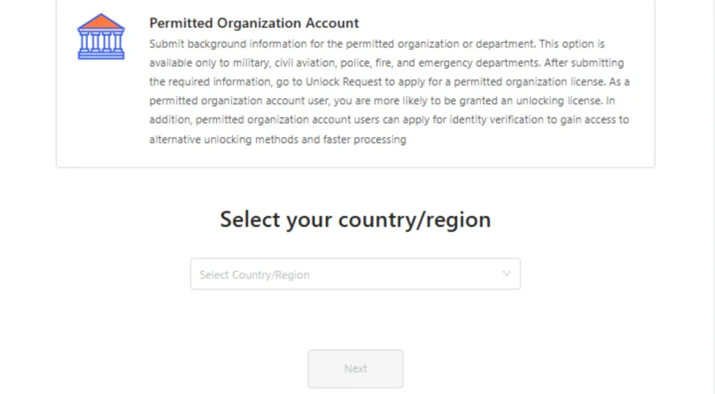 Sau khi xác minh, quay lại trang Unlock để tạo yêu cầu mới. Nếu là tài khoản chính phủ đã xác minh, bạn sẽ có thêm lựa chọn mở khóa — hãy chọn loại phù hợp nhiệm vụ.